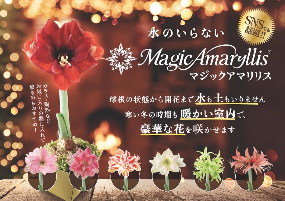 テレビやSNSでも多く取り上げていただきました! おかげさまで、全国で売り切れ続出!ありがとうございます! 今年は、ギフトにおすすめのかわいいソックスを履いたマジックアマリリスも入荷いたしました。 引き続き、全国の小売店、ホームセンター、お花屋さんなどでお買い求めいただけます。